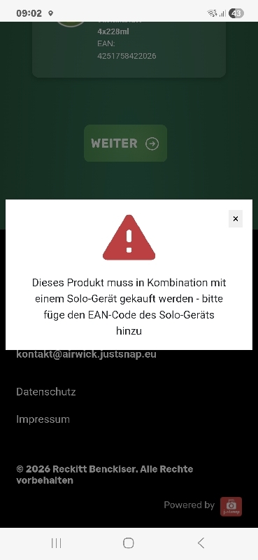 was für eine bekloppte Aktion: ich habe einen freshmatic nachfüller gekauft und soll jetzt noch das dazu passende einzelgerät mit entsprechendem barcode dazukaufen. wenn ich aber von dem einzelgerät den einzigen verfügbaren code, der unter den aktionsprodukten in dieser ellenlangen Liste aufgeführt ist, versuche einzugeben, kommt: ungültige Kombination! HÄ?