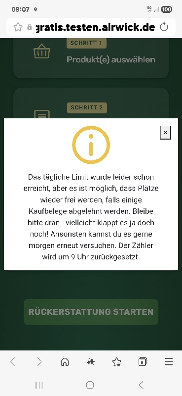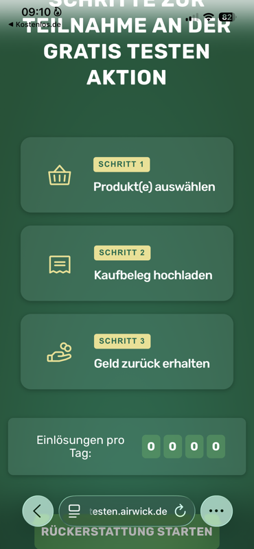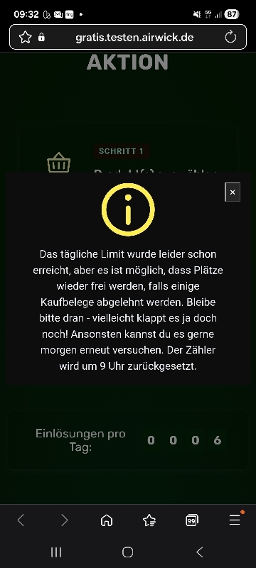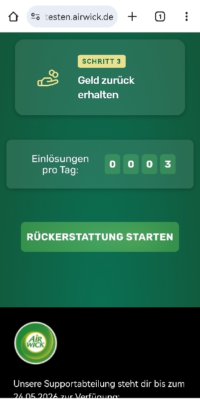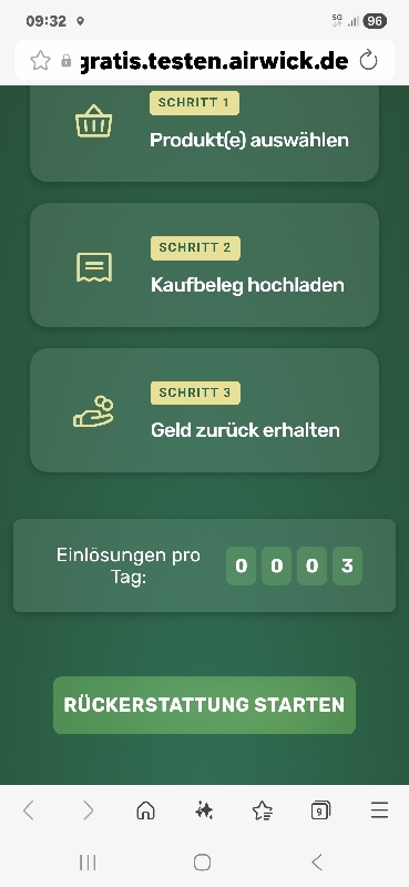 Ein kleiner Fallstrick ist das Tageskontingent. Es sind nur 1.000 Einlösungen pro Tag möglich. Da Air Wick sehr beliebt ist, solltet ihr euren Kassenbon am besten direkt morgens hochladen. Der Zähler wird täglich um 9:00 Uhr zurückgesetzt.