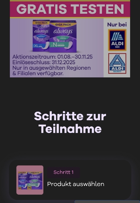 Am 1. August hat eine neue Geld-zurück-Aktion für Alaways Slipeinlagen gestartet: Pro Person dürft ihr jetzt ein Produkt von Always gratis testen. Allerdings muss der Einkauf bei Aldi Nord oder Aldi Süd stattfinden!