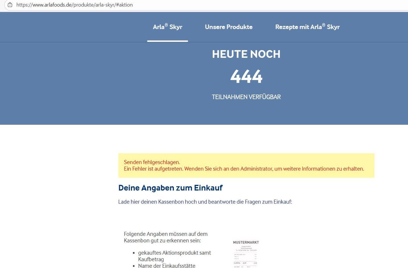 versuche es mal ab 7 Uhr direkt über Arla Homepage. Hatte ein paarmal die gleiche Fehlermeldung wie du und dann bin ich nicht über den von kosstenlos.de Link gegangen sondern Arla direkt und es hat funktioniert