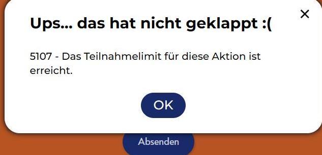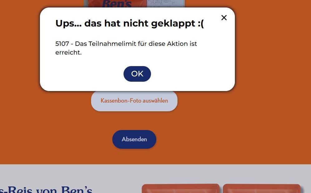 Die Aktion funktioniert offenbar nicht mehr oder wurde vorzeitig beendet. Ich habe soeben mal dort angerufen, die versuchen was zu klären, wussten jedoch auch keine echte Antwort. Heute um 9 Uhr waren auf einmal 441 Einlösungen verfügbar, ich habe über einfügen alles ganz schnell ins Formular geschrieben, Kassenbon hochgeladen und beim Absenden kam diese Meldung. Es werden ganz offensichtlich keine Einlösungen mehr bereitgestellt. Am besten nicht mehr kaufen und teilnehmen, ich versuche meinen gekauften Bens Reis beim Markt zurückzugeben!