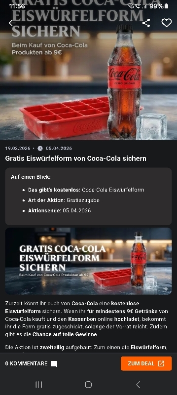 Zurzeit könnt ihr euch von Coca-Cola eine kostenlose Eiswürfelform sichern. Wenn ihr für mindestens 9€ Getränke von Coca-Cola kauft und den Kassenbon online hochladet, bekommt ihr die Form gratis zugeschickt, solange der Vorrat reicht. Zudem gibt es die Chance auf tolle Gewinne.