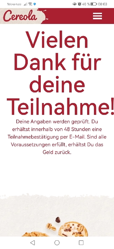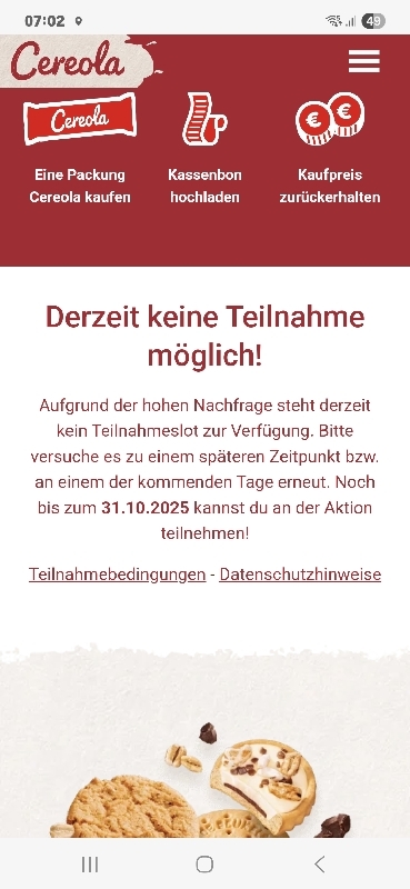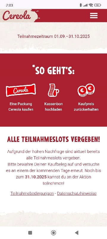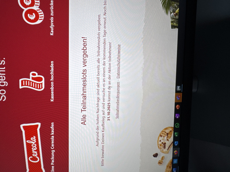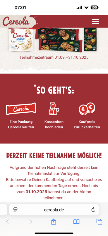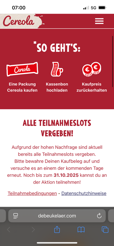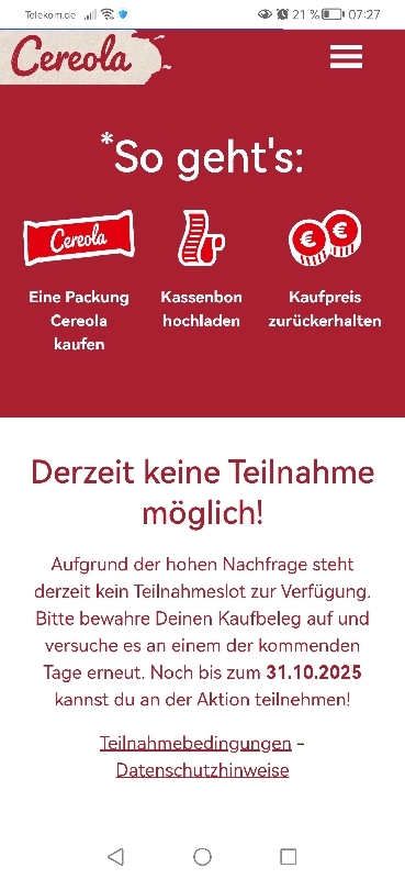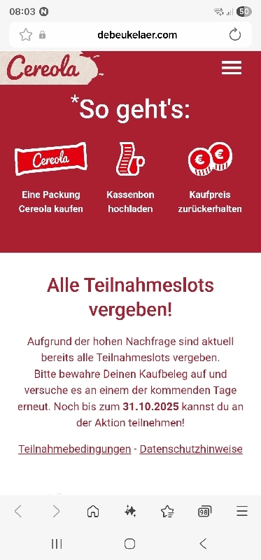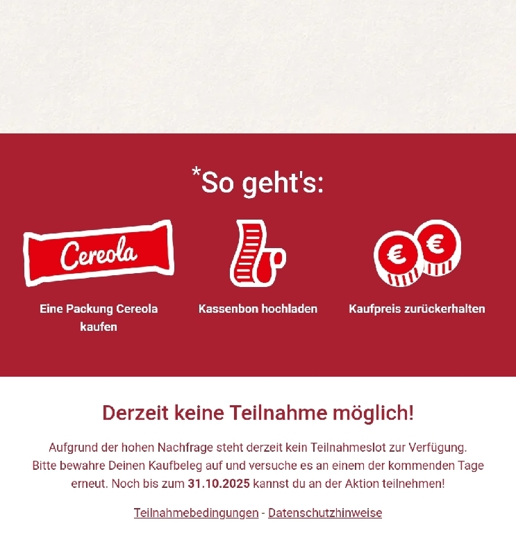 Die Cashback-Aktion ist enttäuschend. Egal zu welcher Uhrzeit man die Seite aufruft, selbst früh am Morgen um 7 Uhr, erscheint bereits die Meldung, dass das Tageskontingent erreicht sei. So wirkt die Teilnahme von vornherein unmöglich und wenig seriös