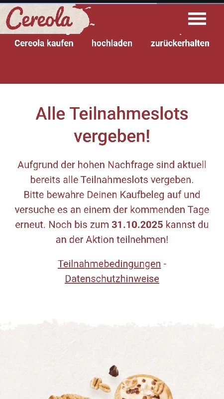 Um 7.01 heißt es “Derzeit keine Teilnahme möglich. Aufgrund der hohen Nachfrage ist kein Teilnahmeslot verfügbar.” – Lasst es, wenn ihr noch keine Kekse gekauft habt…