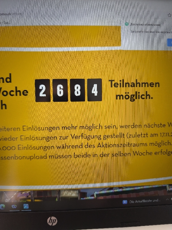 Das Kontingent wird jeden Montag um 08:30 Uhr zurückgesetzt. Um sicherzugehen, dass eure Teilnahme klappt, solltet ihr den Kassenbon am besten direkt zu diesem Zeitpunkt hochladen.