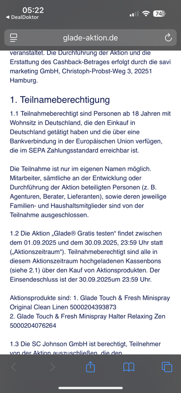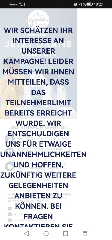600 Einlösungen pro Tag sind nicht besonders viel und innerhalb weniger Minuten aufgebraucht. Wenn ihr auf eine Erstattung angewiesen seid oder Glade nur wegen der Geld-zurück-Aktion kaufen würdet, raten wir von einer Teilnahme ab.