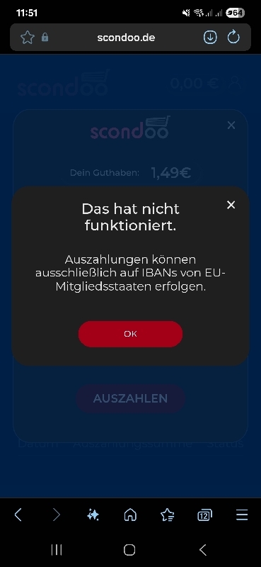 … die Begründung von Scondoo könnte auch falsch sein. Bei dir im Hintergrund steht 1,49€ Guthaben… bei Scondoo kann man sich erst Geld ab 4€ Guthaben auszahlen lassen. Auch nicht wie eine andere Userin hier schrieb ab 5€. Bei Scondoo ab 4€ und bei Marktguru ab 5€ Guthaben…. Vielleicht ist das hier der Grund.