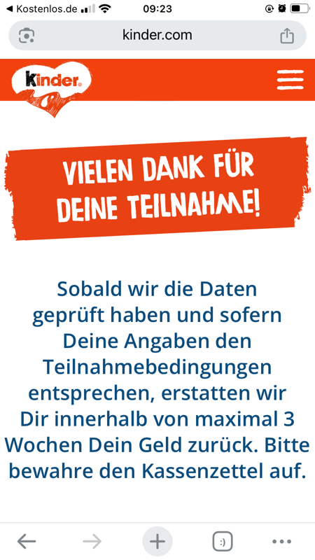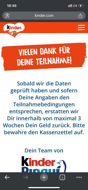 Ferrero behält sich das Recht vor, den Kaufbeleg nachträglich einzufordern. Deswegen solltet ihr euren Kassenbon unbedingt aufbewahren, bis das Geld bei euch angekommen ist. Nach dem Ausfüllen des Formulars solltet ihr den Kaufpreis innerhalb von maximal drei Wochen zurückerhalten.