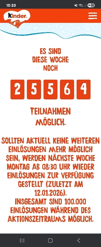 Die Aktion ist auf insgesamt 100.000 Einlösungen begrenzt. Es gibt außerdem ein wöchentliches Kontingent. Laut den Teilnahmebedingungen werden die Einlösungen jeden Montagmorgen ab 8:30 Uhr wieder aufgefüllt. Falls also in der aktuellen Woche schon alle Erstattungen vergeben sind, müsst ihr einfach bis zum nächsten Montag warten und es dann wieder versuchen.