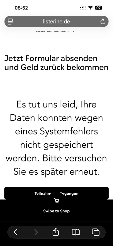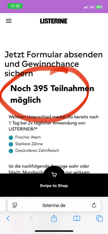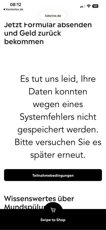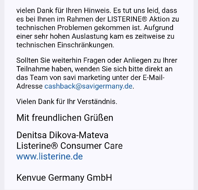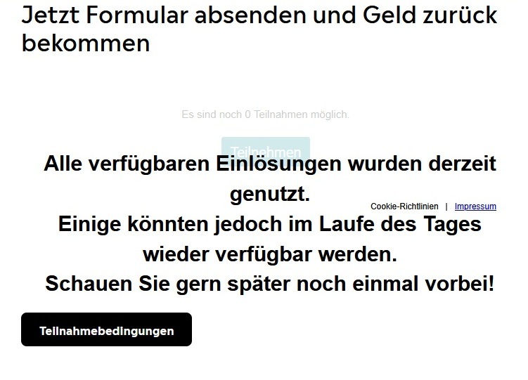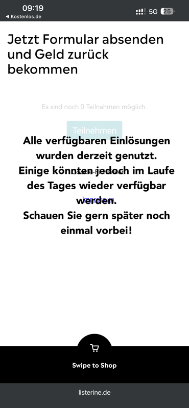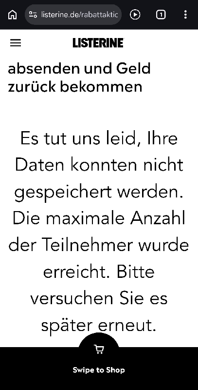 Interssant. Heute, Montag, waren vor 08:00 Uhr über 400 Teilnahmen möglich. Natürlich konnte man das Formular ausfüllen und nach dem Absenden wieder „technischer“ Fehler. Nach einem Reloud der Seite zählte der Counter auch runter und es wurde immer weniger. Zu 08:00 Uhr war dann totales Chaos und dann ging irgendwie gar nichts mehr. Ja und dann als sich mal wieder das Formular öffnen wollte, stand dort alle Einlösungen weg. Was für eine stümperhafte Umsetzung von Savi Germany. Und das habe ich per Mail denen auch geschrieben. Und mal schauen, ob ich Listerine auch noch diesbezgl schreibe. Diese Firma hat es nicht verdient so etwas technisch umzusetzen. Sie können es nicht und weisen auch jegliche Schuld von sich und schieben es auf das vorgeschriebene Kontigent. lächerlich!