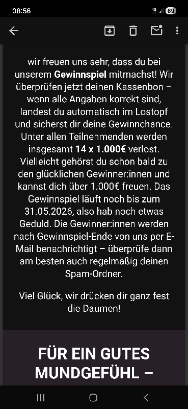 Außerdem ist es verwunderlich, dass die Aktion bislang nicht wirklich bekannt war, aber schon jetzt Einlösungen erfolgt sind – eigentlich muss die Mundspülung ja 14 Tage getestet werden.