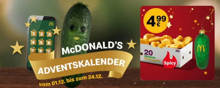 Kennt ihr schon den McDonald’s Adventskalender? Hinter dem heutigen Türchen hat sich ein Coupon versteckt, mit dem ihr die McDonald’s Weihnachtsgurke gratis zu 20 Chicken McNuggets für 4,99€ erhaltet.