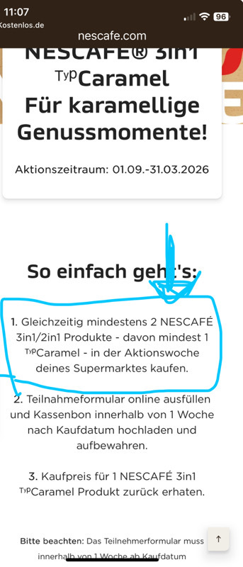 Ihr müsst zwei Produkte von NESCAFÉ 2in1 oder 3in1 auf einmal kaufen. Eines davon muss zwingend die Sorte NESCAFÉ® 3in1 ᵀʸᵖCaramel sein. Nur für diese Sorte bekommt ihr den Kaufpreis erstattet.