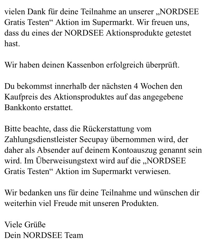 Bereits am 01.09.25 alles eingereicht, die Bestätigung kann schon am 02.09.25, dass die Auszahlung innerhalb von 4 Wochen (28 Tage) erfolgt. Bis zum heutigen Tage 09.10.25 ist keine Auszahlung erfolgt. Auf Rückfragen erhält man keine Antwort. Fazit nie wieder Produkte von "Nordsee" kaufen !!