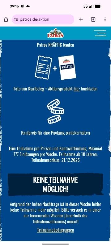Das Kontingent ist auf 777 Einlösungen pro Woche begrenzt. Das bedeutet, dass der Zähler vermutlich zu Beginn jeder Woche zurückgesetzt wird. Wenn das Kontingent für die laufende Woche aufgebraucht ist, müsst ihr es in der nächsten Woche erneut versuchen. Hier kann es sich also lohnen, den Bon direkt zu Wochenbeginn hochzuladen. Eine kleine Besonderheit gibt es beim Upload: Ihr müsst den Kassenbon zusammen mit dem gekauften Patros fotografieren. Achtet darauf, dass auf dem Foto alles gut lesbar ist.