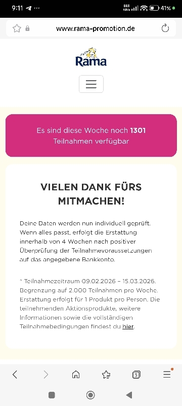 Ansonsten läuft die Teilnahme sehr unkompliziert: Ihr braucht keinen Aktionssticker, ein einfacher Kauf im Supermarkt reicht aus. Achtet nur darauf, dass ihr pro Person (definiert durch Name, E-Mail und IBAN) nur einmal teilnehmt.
