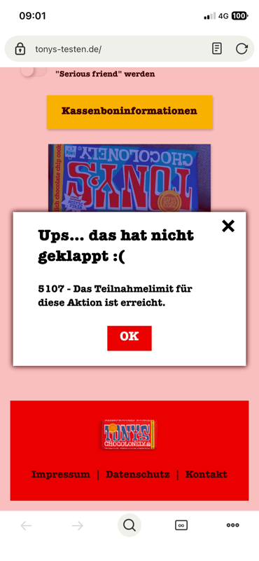 Habe heute pünktlich alle Daten eingegeben und um 9:01 auf absenden gedrückt. Seite reagiert nicht. Keine Bestätigung, keine Fehlermeldung. Bin um 9:02 noch ein mal rein und alles schon vergeben! Das kann doch echt nicht sein. Die erste Seite habe ich immer noch auf, aber da passiert nichts. Echt doofe Aktion. Habe die Schoki für mich und meine Mutter gekauft….