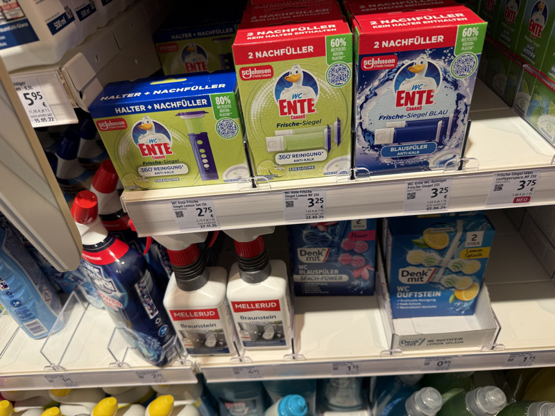 Wahrscheinlich findet ihr WC-Ente Frische-Siegel besonders einfach bei dm oder Rossmann. Aber auch gut sortierte Supermärkte wie Rewe oder Edeka führen das Produkt. Schaut mal ins aktuelle Prospekt, wenn ihr wissen wollt, was es bei Edeka so im Angebot gibt: