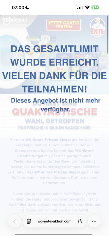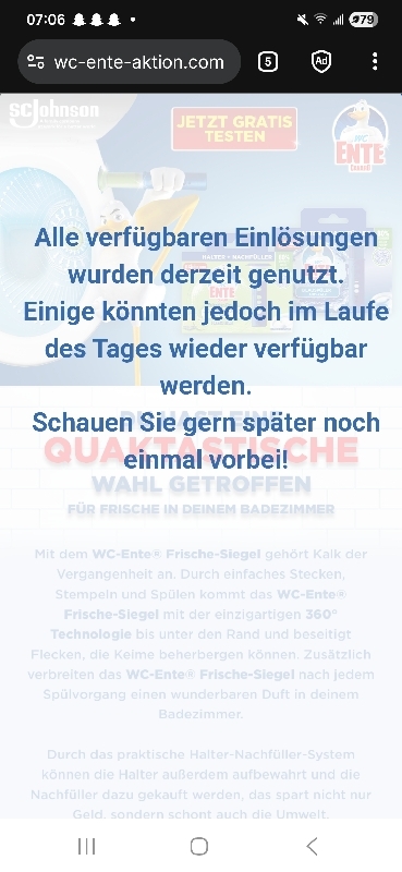 Montag um 07:10: „Alle verfügbaren Einlösungen wurden derzeit genutzt.Einige könnten jedoch im Laufe des Tages wieder verfügbar werden.Schauen Sie gern später noch einmal vorbei!“ – Ist klaaar was für eine Abzocke werde es zurückgeben